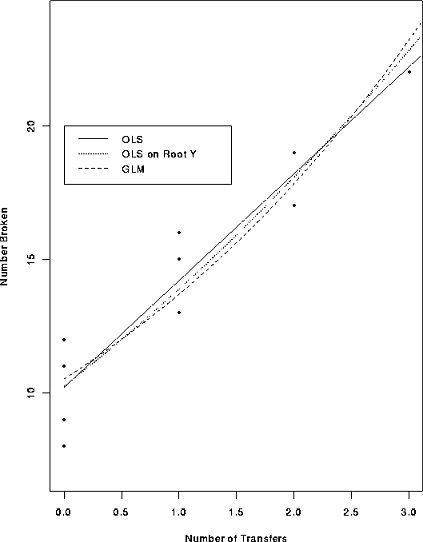 legend(0,20,lty=1:3,legend=c("OLS","OLS on Root Y","GLM"))