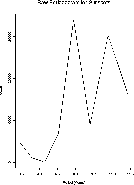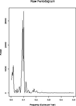 Notice the peak at a frequency slightly below 0.1 cycles per year