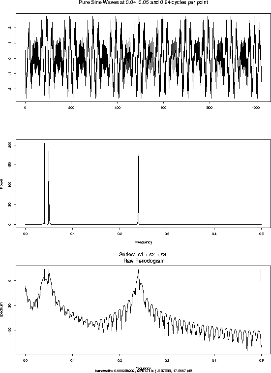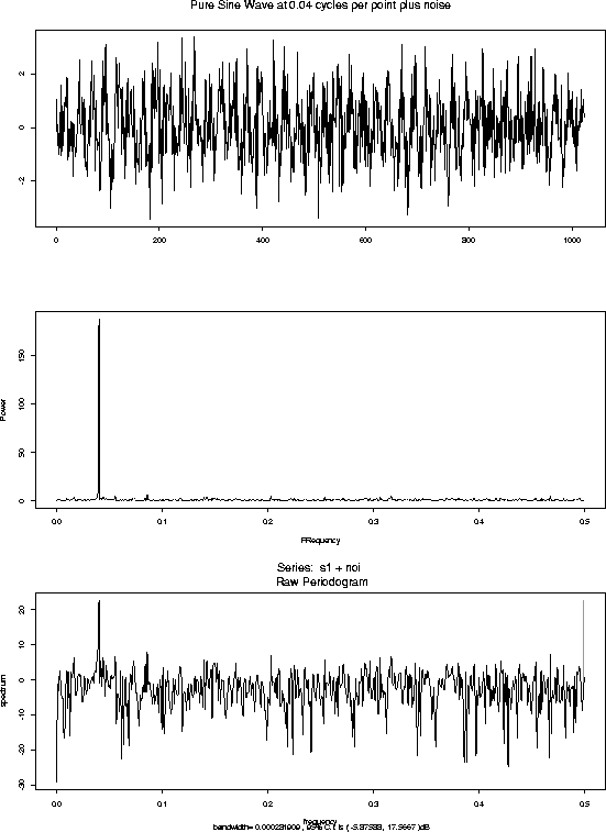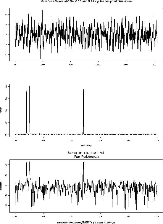 wave with no noise. The middle panel is a direct plot of the periodogram