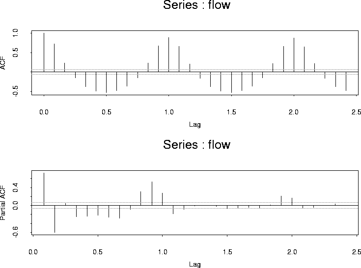 The plots do not provide a clear simple model but suggest we need something at lags 1, 2 3 and perhaps 12 or so. The latter point is motivated by the idea that there is some effect of the previous years weather. It is far from clear that such an effect should be summarized in terms of the flow precisely a year ago and you might instead consider coefficients at several lags in the previous year. I tried to begin by ignoring the effects of the previous year and just fit an AR(3).