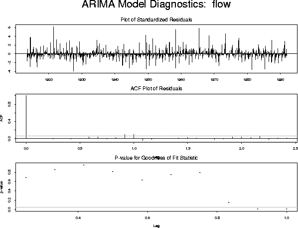model.3 <- list(model.2, list(order = c(1, 0, 0), period = 12)) fit.3 <- arima.mle(flow, xreg = xrf, model = model.3)which produces the diagnostic plot: