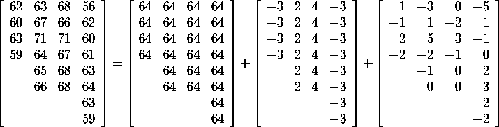 The data consist of blood coagulation times for 24 animals fed one of 4 different diets. In the following I write the data in a table and decompose the table into a sum of several tables. The 4 columns of the table correspond to Diets A, B, C and D. Later in the course we will do matrix linear algebra and then want to think of stacking up thes 24 values into a single column vector but the tables save space.