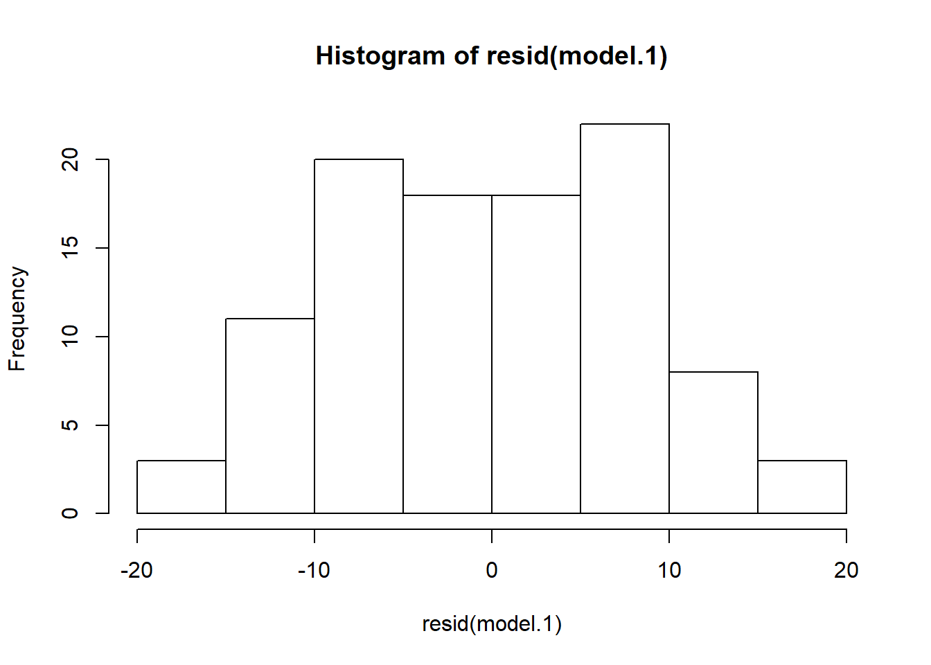 The residuals() function returns a vector containing the residual for each row in the dataset. Recall that the residual is the difference (or “error”) between the observed value of the response variable and the predicted value based on the linear model. We can plot theses residuals just like any other data using base R functions like hist and boxplot. Although not as pretty as gglplot graphics, they give us a quick sense for whether our model is valid.