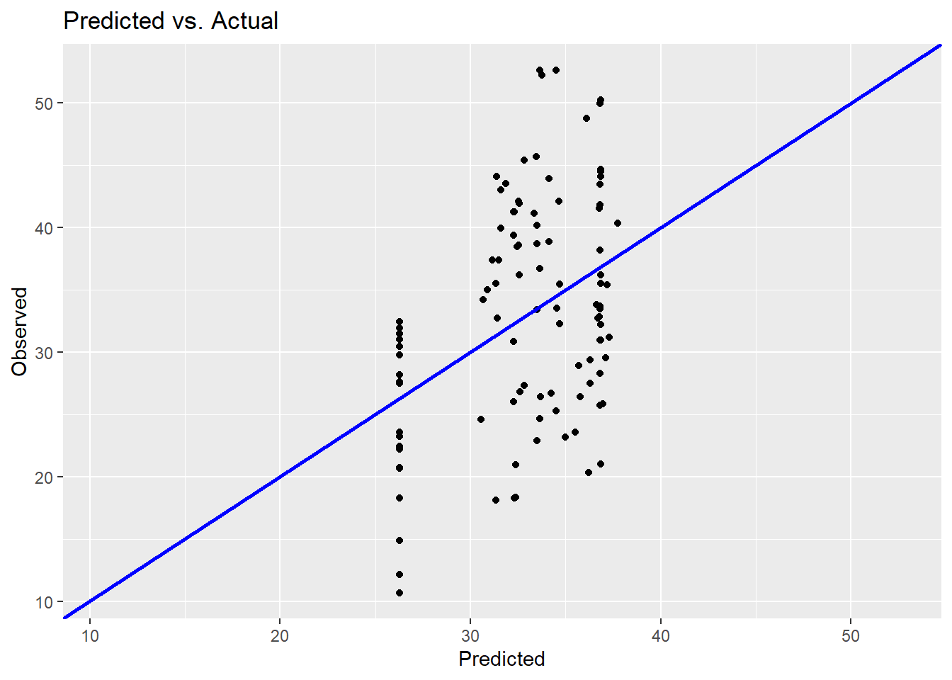 Ideally, we would have a perfect 45-degree line through the data points meaning that observed and predicted are similar. In this plot you see some deviation (in accordance with the low R2).