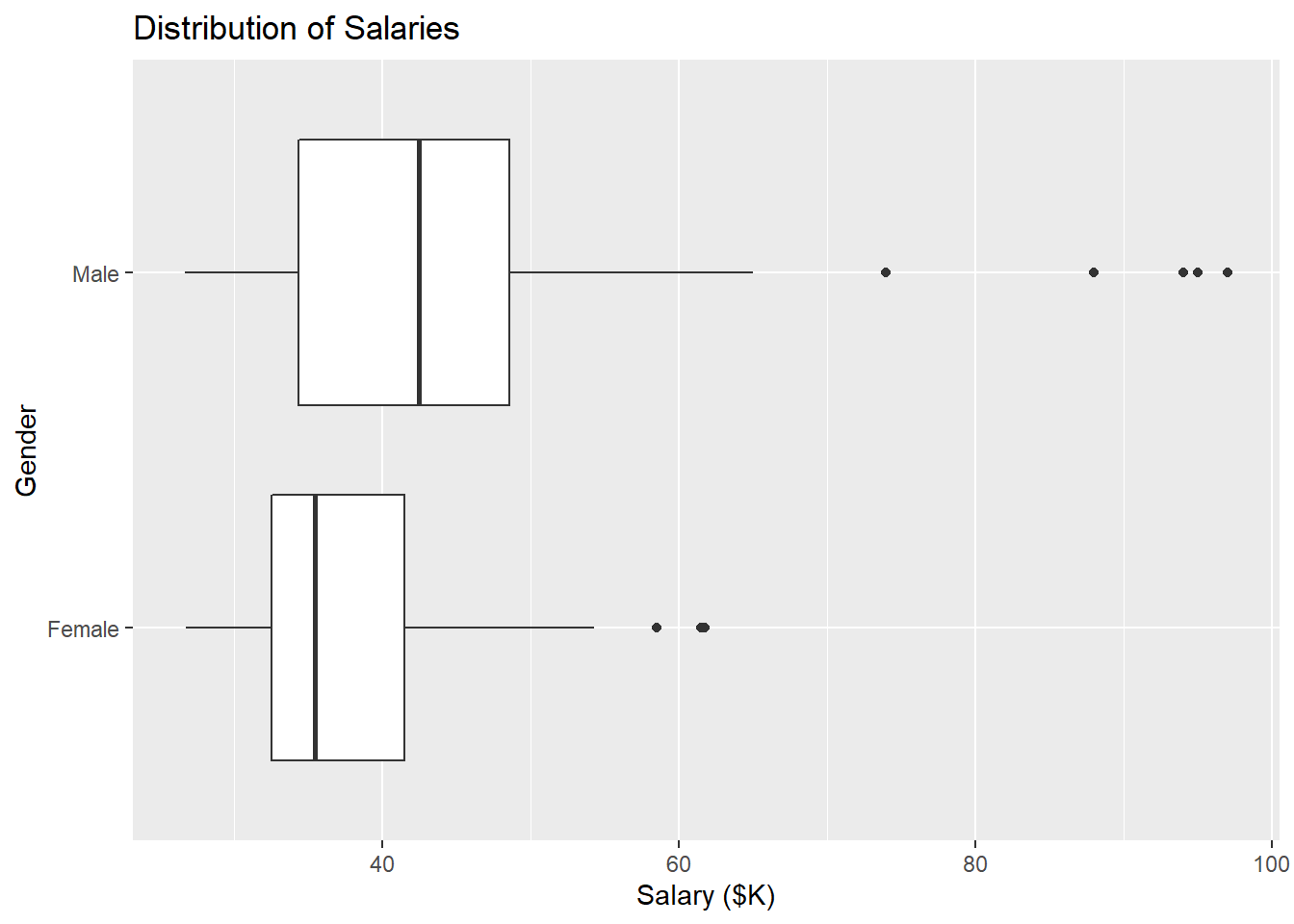 Recall in Lesson 3 that the ggplot version of boxplot expects two axes: a measure (like Salary) and a grouping variable (like Gender). Creating a comparative boxplot is thus extremely simple in ggplot: