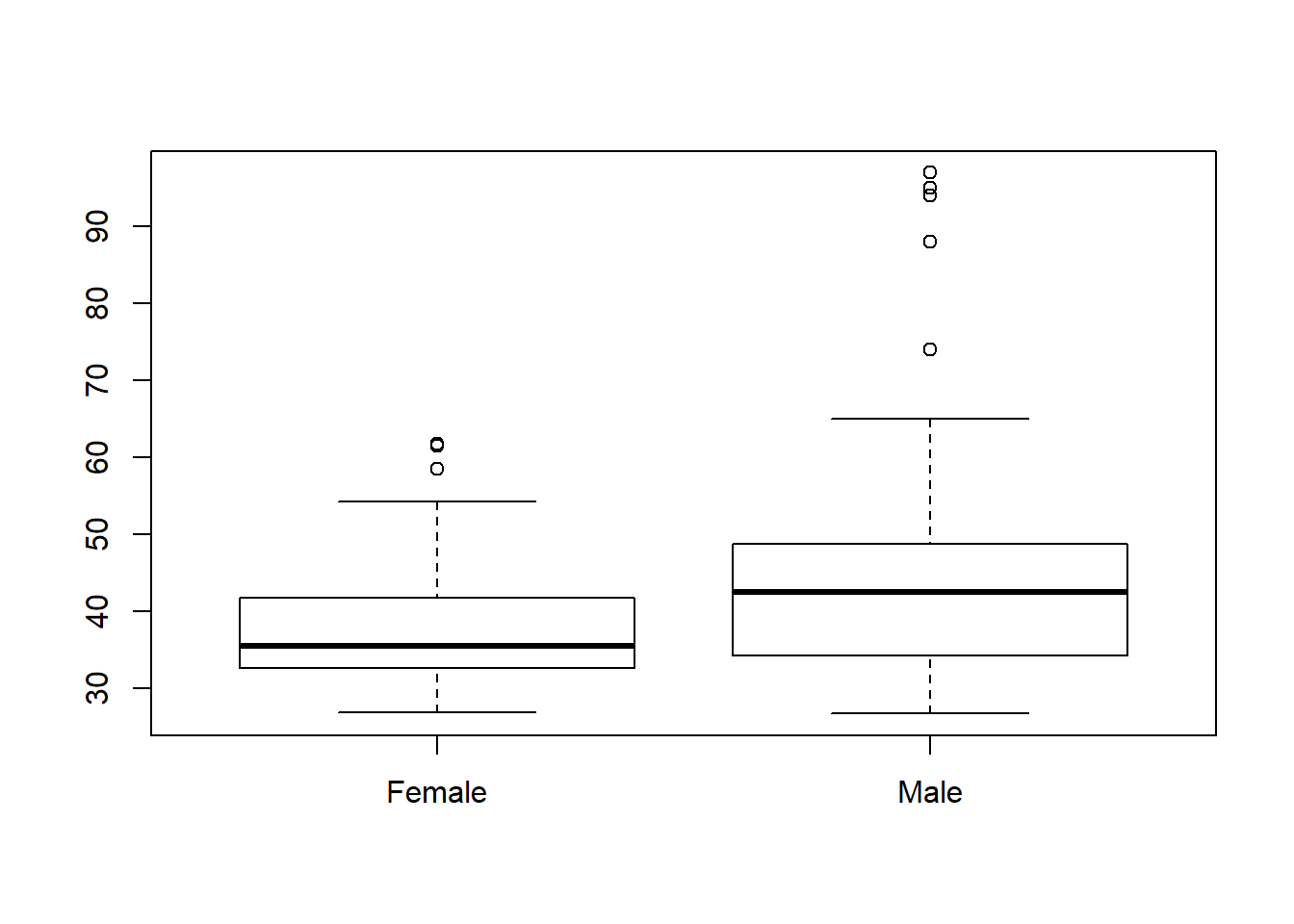 Here we call the boxplot function with two arguments: the formula followed by the source data (our Bank tibble). R reads the formula and understands we want to see how Salary varies with the different values of Gender.