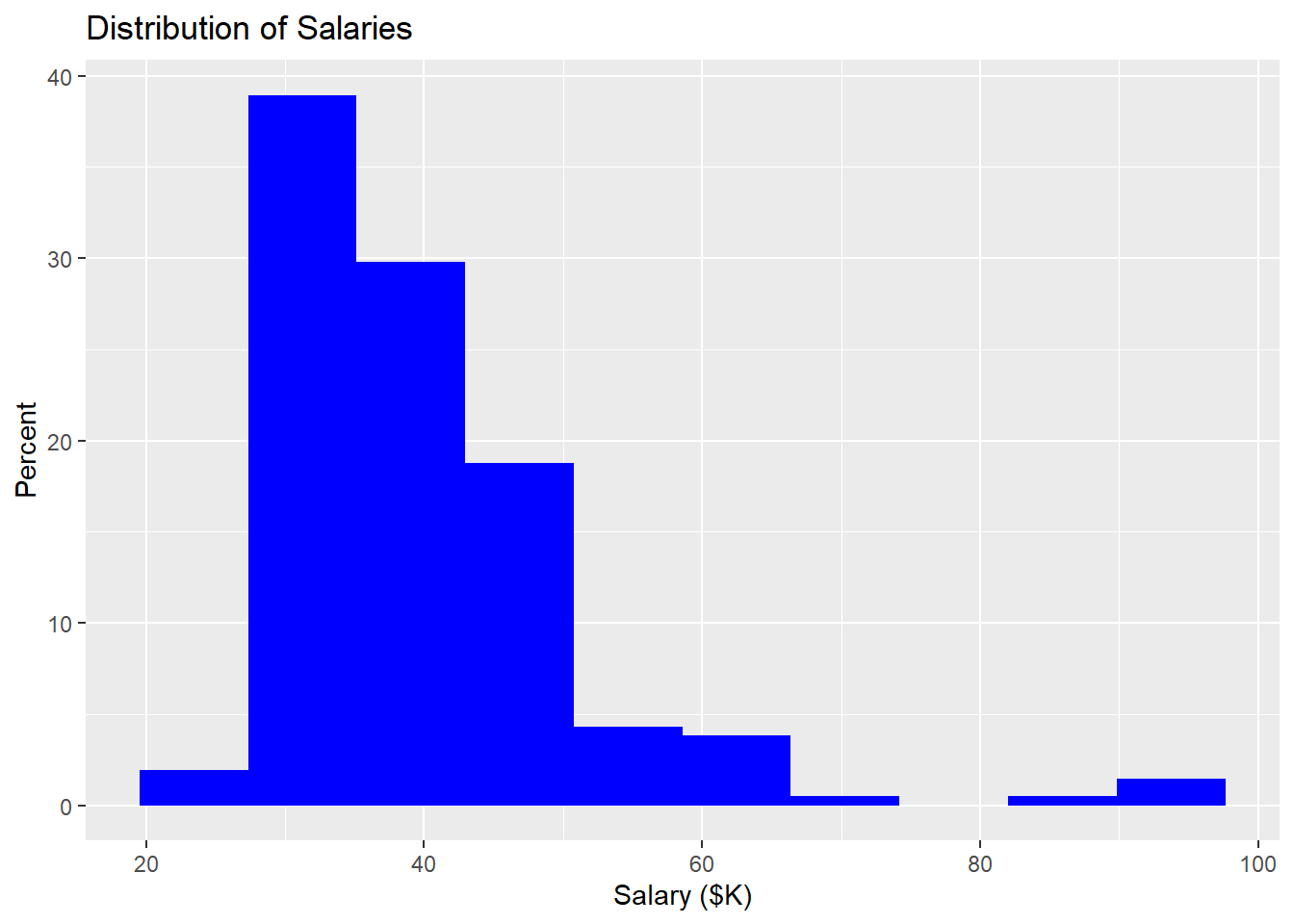 geom_histogram(mapping=aes(x=Salary, y=..count../sum(..count..)* 100), bins=10, fill="blue") +