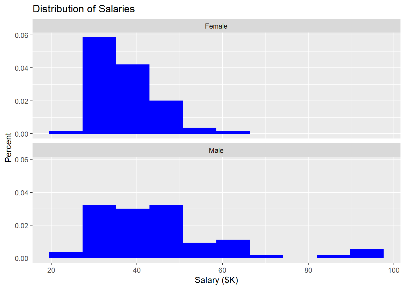 Comparative histograms in base R are possible, but very complex. In contrast, ggplot allows us to extend our basic histogram (recall the visualization tutorial) with facets. To illustrate, recall the basic histogram for all bank employees: