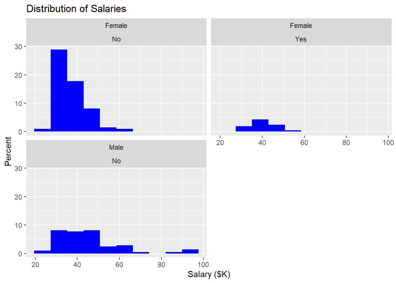 Can the formula be more complex? Yes. We can look at the distribution of Salary as a function of Gender and PCJob (the other discrete variable in the Bank tibble) by writing the formula as Y ~ Gender + PCJob. Note that we get a salary histogram for each combination of the two variables. One quadrant is missing because, apparently, there are no males with PC jobs in this bank: