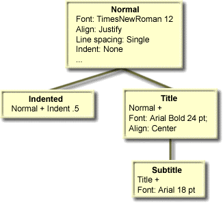 If you change an attribute of a style higher in the hierarchy, you also change the styles dependent on it, unless that attribute is different in the dependent style. In the example above, if you change the line spacing of "Normal" to "Double", the line spacing of all the other styles will also change to "Double". But if you change the font of "Normal" to "Courier New", only "Indented" will change, since the other styles already have "Font" set to "Arial".