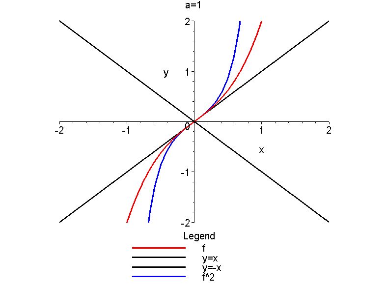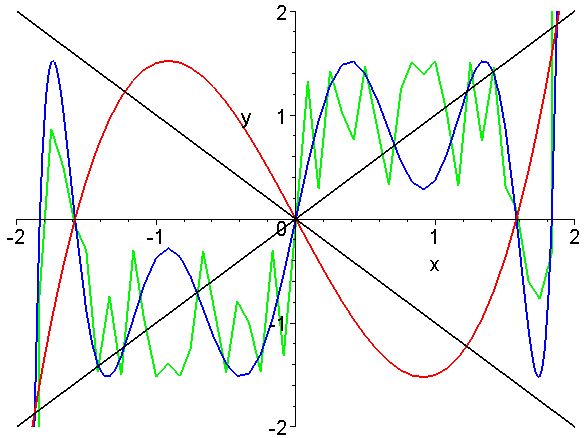 To answer the second question, use the plot below of f(x) (red), f 2(x) (green), f 3(x) (blue), and the diagonal line y = x (black), and hand this in with your assignment. For reference, the line with slope -1 passing through the fixed point near x=-3 has been added (cyan colour). You may have to calculate the derivative of f at the fixed point near x = -3 to decide the stability there (it may not be obvious from the graph below).
