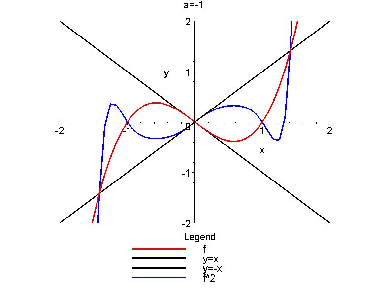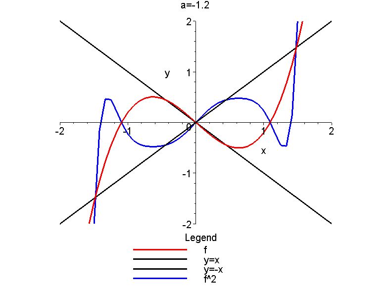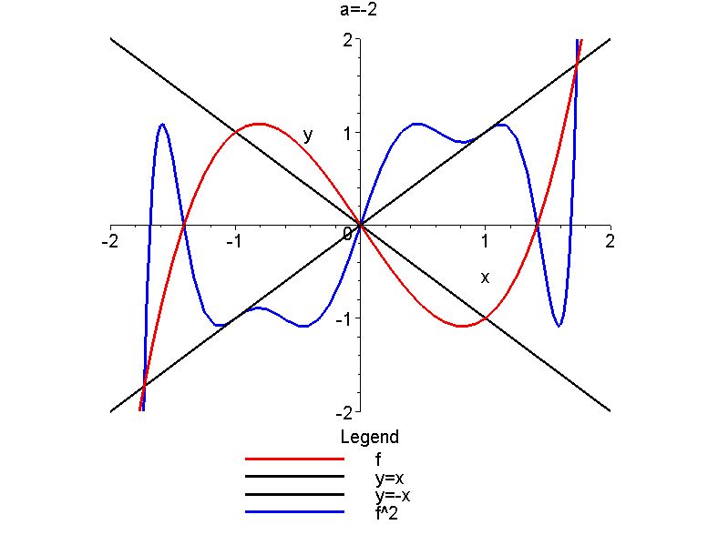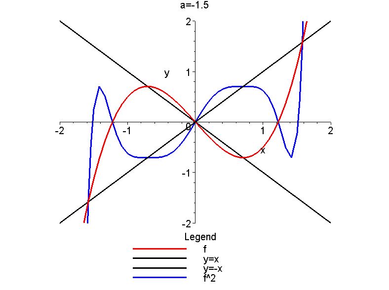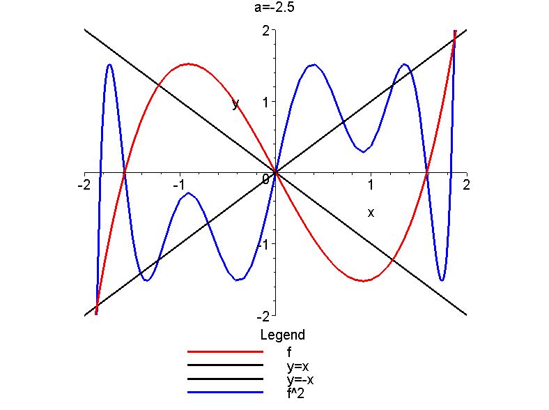 Draw the bifurcation diagram and the final state diagram of ga(x) = x3 + ax for a from -2.5 to +2. Do not try to solve the equation ga(x) = x to find the fixed points; instead, use the plots below of the graphs of g and g2 for various a (a = 2, 1, 0, -1, -1.2, -1.5, -2, -2.5) to sketch the bifurcation diagram. You will, however, need to determine the stability of the periodic points (for the final state diagram). You may use the fact that ga has no periodic points of prime period greater than 2 for these values of a.