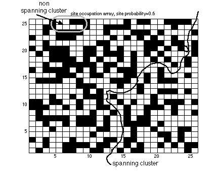 Percolation is the study of lattices in dimensions of 2 or higher with regards to the pathways through such lattices. Take the example of a sponge that is divided up onto a square shaped grid. We can refer to such a grid as a lattice. For this example, consider any 2-dimensional cross section of this grid. If this lattice is divided up in an equal manner, then the study of different values for the probability of any location on this lattice being an open space will tell us what the largest percentage of open space in the sponge can be before the sponge stops holding water. The exact probability value at which the sponge under goes a phase transition from being able to hold water to being unable to hold water is called the threshold probability value pc. The closer the probability p gets to pc, the more liquid the sponge can hold, however, crossing the threshold will mean that chances are greater that the sponge can hold an infinite amount (as water flows straight through the sponge without being captured at all). When water can flow from one end of the sponge, right through and out another side, we say that percolation has occurred. Looking at figure 1, we can see that a group or cluster of sites that together give a path through the lattice is called a spanning cluster, and a group that does not is called a non-spanning cluster.