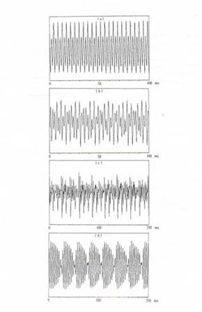 Figure 9: Acoustic waveform from sustained vowels. The top one was produced by a normal subject, whereas the latter three were produced by patients pathological vocal cord disorders