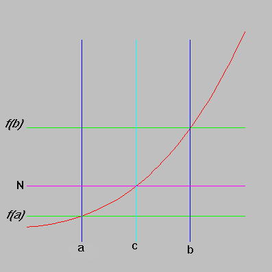 If f is continuous on the closed interval [a,b] and N is any number between f (a) and f (b), then there exists a number c in the open interval (a,b) such that f (c) = N.