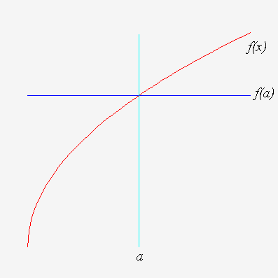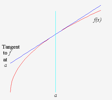Of course the constant approximation is not a very good approximation, especially if the slope of the function is steep. A better approximation is to assume that the function is a straight line. The obvious line to take is the tangent line at a, since this will allow for the slope of f near a.