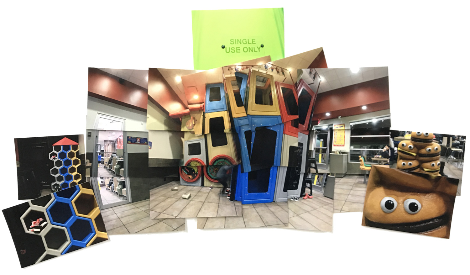 Based on Rem Koolhaas’ conception of Junkspace, students research and choose a space which is exemplary of junkspace. Photos of this space are used to compose a panorama. The assignment is to take a series of about 20 pictures from one spot in the centre of a room or space, systematically shooting a complete 360º set of images. Take a picture; before moving, notice what’s at the edge of the frame in the direction you plan to rotate. Turn until what you noticed is now at the opposite side of the frame; take the next picture, and so on. Do several rehearsals first, making sure you get the maximum coverage; the pictures should overlap slightly. Do not use panorama functions with cellphones! The images will be printed out in class and assembled into a panorama.