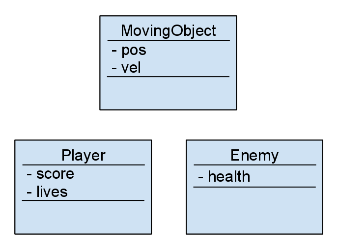 A UML diagram for a class begins with the class name at the top. Clearly we are going to define a Moving Object class, followed by two sub-classes: Player and Enemy.
