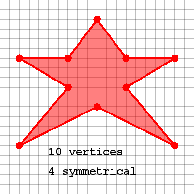 Here is a simple star shape plotted using 10 vertices. It's important to note the symmetrical vertices of a shape since this will simplify the plotting of the shape. Here we have 4 symmetrical vertices on each side of the star. Below we'll see some code for how to draw the star shape.