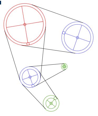 In this example, my red power wheel in the upper left drives two smaller blue wheels with two belts: one to the right and one below. The left blue wheel in turn drives the two small green wheels with two belts.