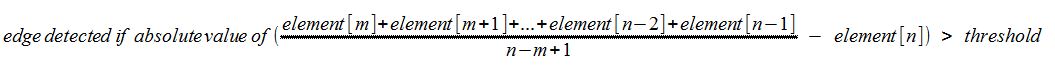 where the threshold is a user defined value, the average[(element[m] + element[m + 1] + ... + element[n - 2] + element[n - 1])/(n - m + 1)] is a running average sum of the elements preceding to the current, thus letting the user to imply a much larger threshold than it would be possible to use in case of a simple differentiation algorithm. Further, once an edge is detected, the very running average can be stored, as it will define the average value of region from m, the last edge, till n, the current edge.