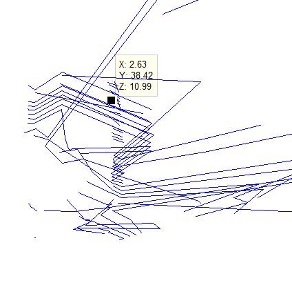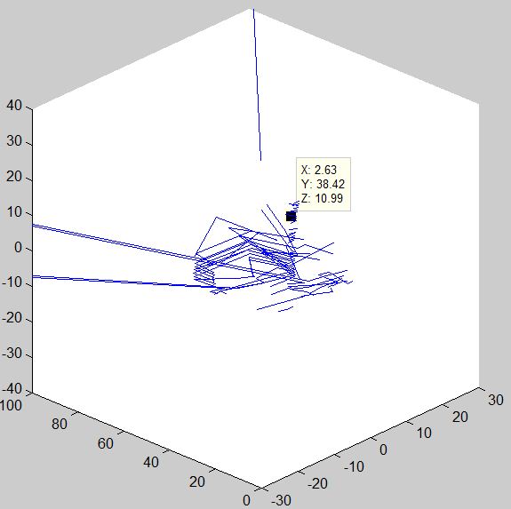 Once the correct relations between the regions from the two images have been obtained, it takes easy trigonometric formulas to obtain the 3Dimensional position of the region boundaries. After the necessary tweaks and configurations, following is the result obtained from the algorithm, The 3D points from the algorithm are being displayed in a 3D plot, linking the points in a single horizontal plane with solid lines.|