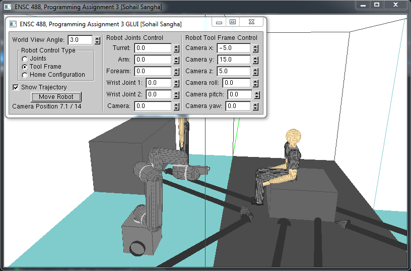 Design and rendering of a mobile robotic arm in OpenGL. Project aimed at designing and implementing forward/inverse kinematics control strategies, state space path planning, familiarity with jacobians and robot C.G. checking in a simulated environment.