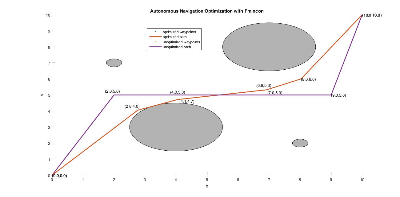 Use of optimization toolboxes and strategies in MatLab to optimize the navigation path of robot traversing a 2D plane using way-point navigation.