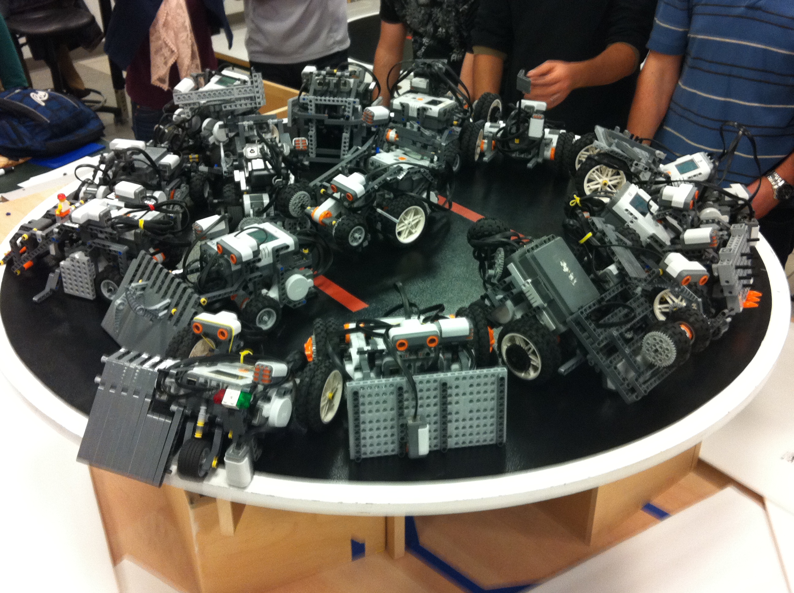 Lego robots designed with weight and size restrictions with explicit purpose of pushing the opponent off the circular stage.