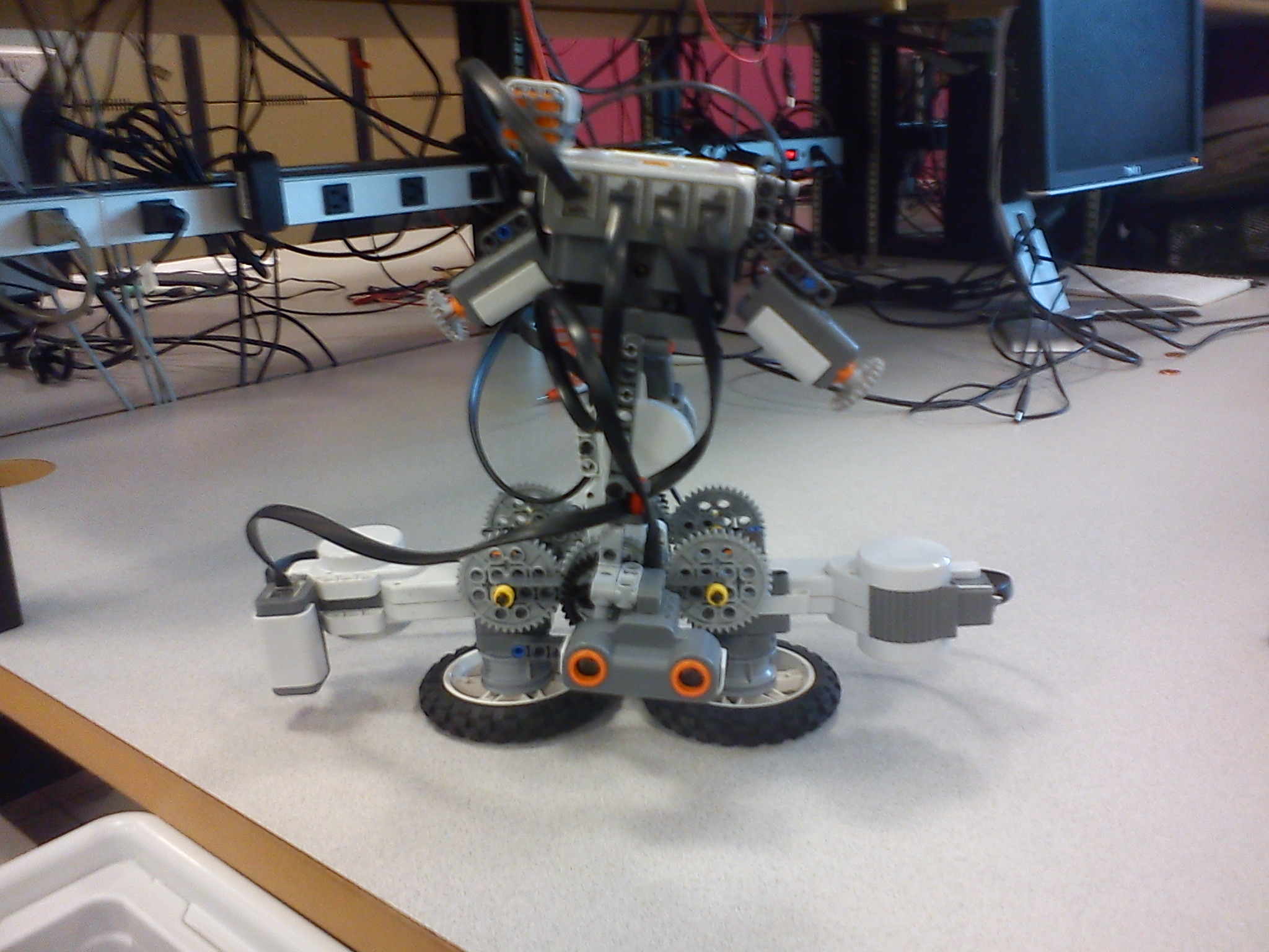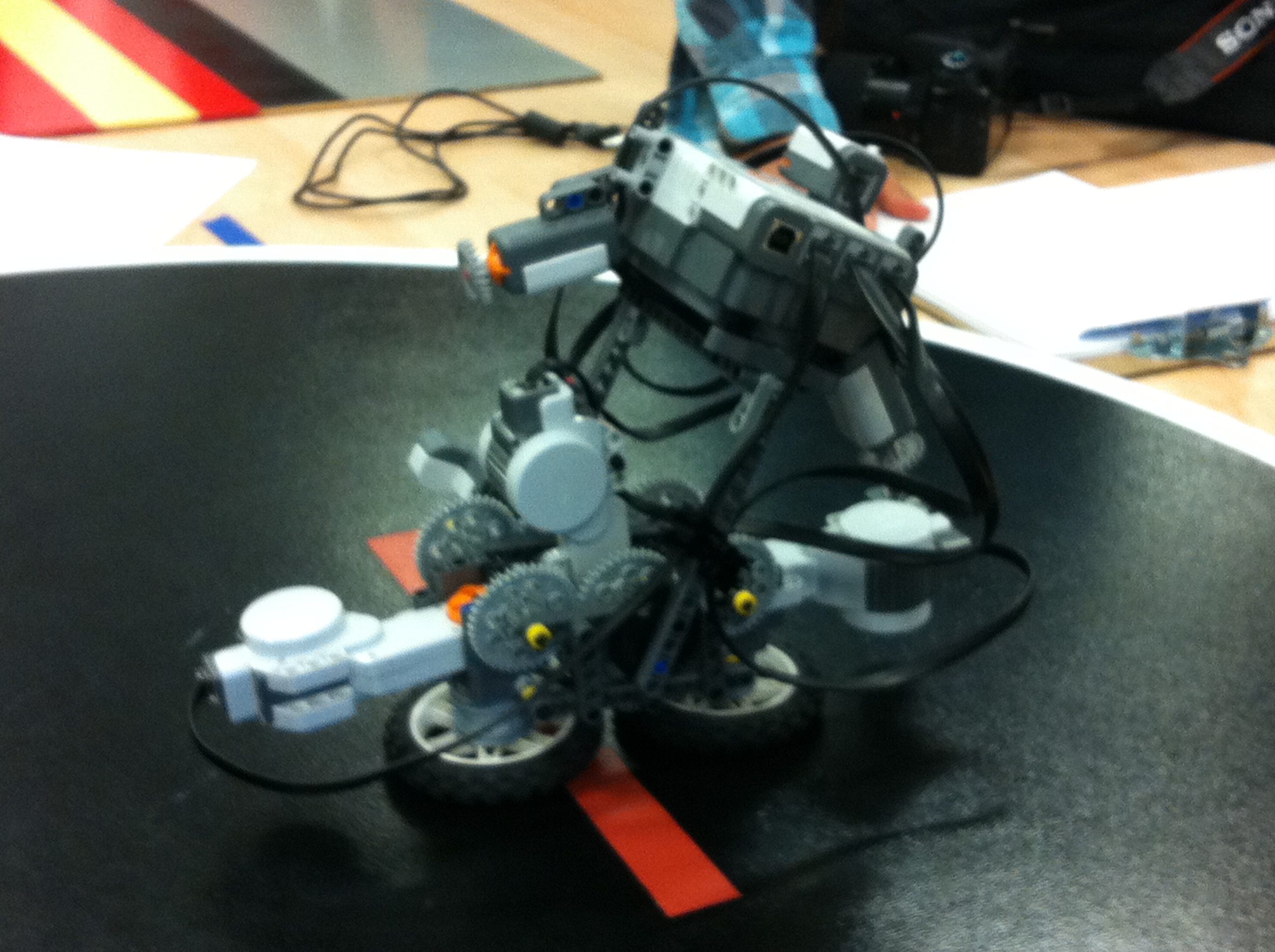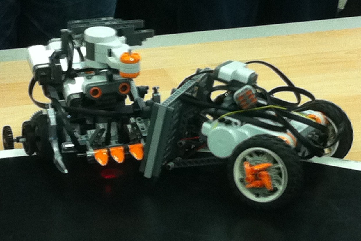 | Biped with ultrasound for opponent detection, touch sensors for brick shift detection, IR sensor for stage boundary detection, sound sensor for clap control. | Biped in action. |