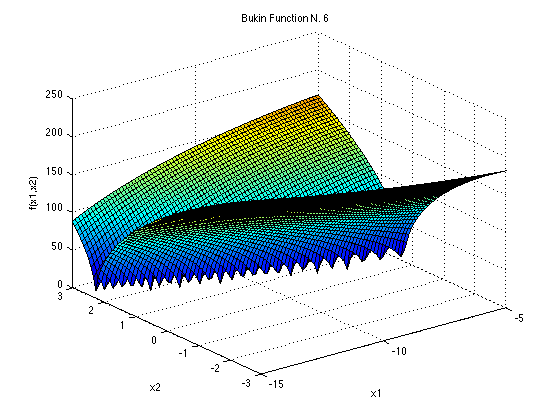 Dimensions: 2The sixth Bukin function has many local minima, all of which lie in a ridge.
