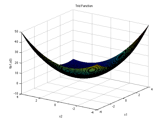 Dimensions: dThe Trid function has no local minimum except the global one. It is shown here in its two-dimensional form.