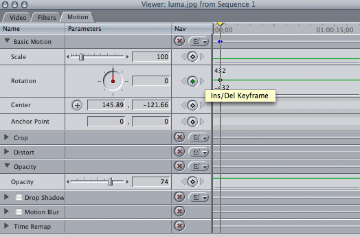 4. Keep luma.jpg selected and navigate to Motion tab. Turn down the Opacity a bit, move your play head to the time you want the light starting to turn, go to Rotation and click on the insert keyframe button (a round button with a diamond shape in it). After you click, you will realize there is a diamond shape dot that appears on the mini-timeline; it means that a keyframe has been inserted at that point.