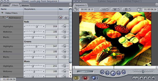 1. Go to Effects>Color Correction> RGB Balance, drag RGB Balance to sushi.jpg on the timeline, you will see under Filters, there are many options showing up; from there you can adjust individual color channels of your image.