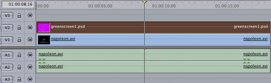 Drag greenscreen1.psd to the top of napoleon.avi and extend the length of greenscreen1.psd to the same as napoleon.avi