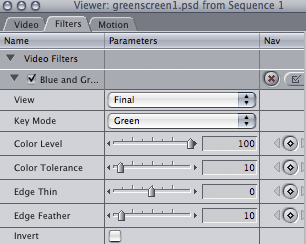 5. Play with attributes in the Blue and Green Key filter until all the green is removed. Navigate to Filters tab; you will see the Luma Key attribute.