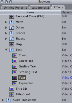 1. To create a new title clip, in the Browser window, go to Effects>> Video Generator >> Text >>Text. Drag the title to your Timeline. Alternatively, you can access Titles in the Viewer window by accessing the titles menu in the bottom right of the Video tab. Click on the A and choose Text>> Text.