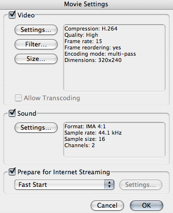 2. Click on the Options menu in the QuickTime exporting dialogue box to bring up movie setting. From here you can effect the compression settings, video size and even apply filters to the video. One of the key features of Quick Time is Fast Start (at the bottom). This allows the file to be played while the download is still in process without any additional software on the server. Change the Quality to Low in the Settings menu and then select OK. Export the clip.