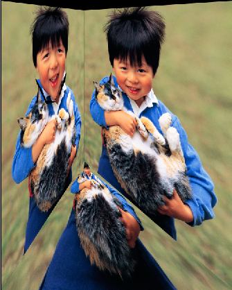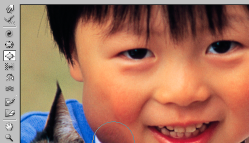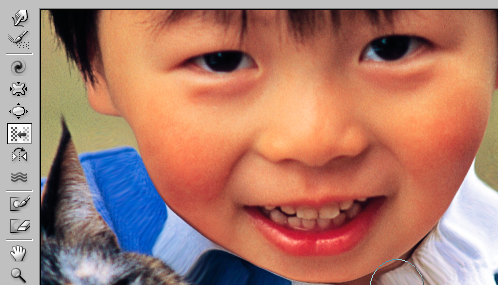Let us look at some examples of what Liquify can do; the kid's and the cat's eyes have been exaggerated in size; as well, the third example shows that the kid's face have been bloated up.