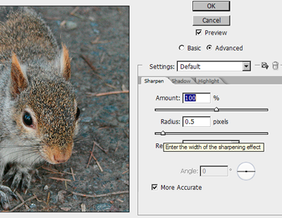 2. Here you can see the dialogue box; keep the preview check box on and move the Amount and Radius slider till the image looks fine; Hold on your cursor on the image you can see the image before the sharpening.