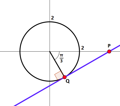 A tangent line to a circle at a point \(P\) on the circle is perpendicular to the line through \(P\) and the centre of the circle. See Figure 5.9.