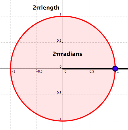 Angles and numbers – Three. Starting at the point \((1,0)\text{,}\) to each real number \(x\) we associate the unique point \(X\) on the unit circle so that \(X\) is the end point of the arc of the signed length \(x\text{.}\)