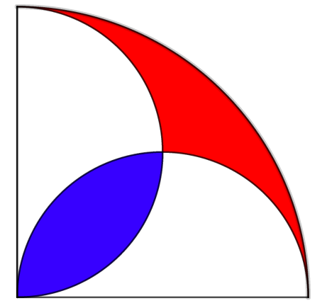 Puzzle: Illustrated below is a quarter-circle, containing two semicircles of smaller circles. Prove that the red segment has the same area as the blue.