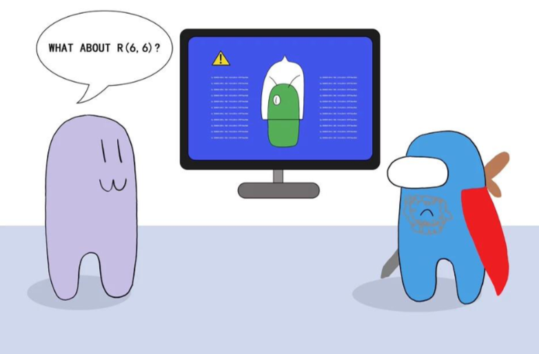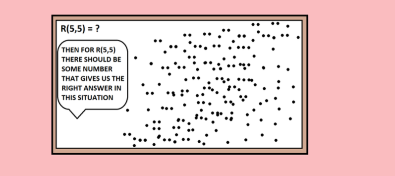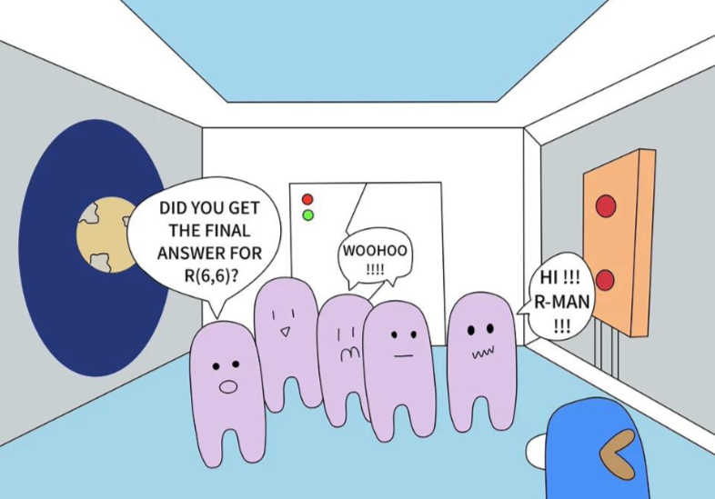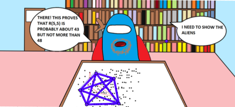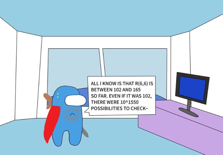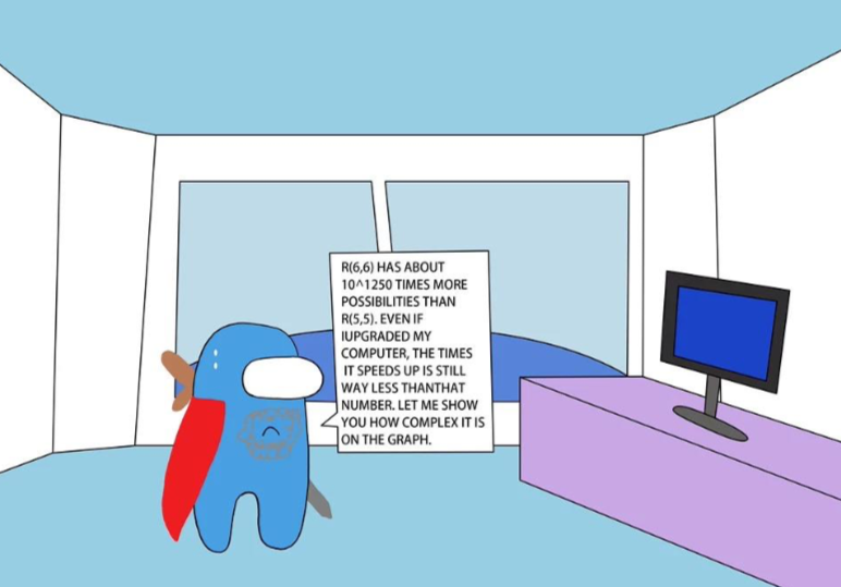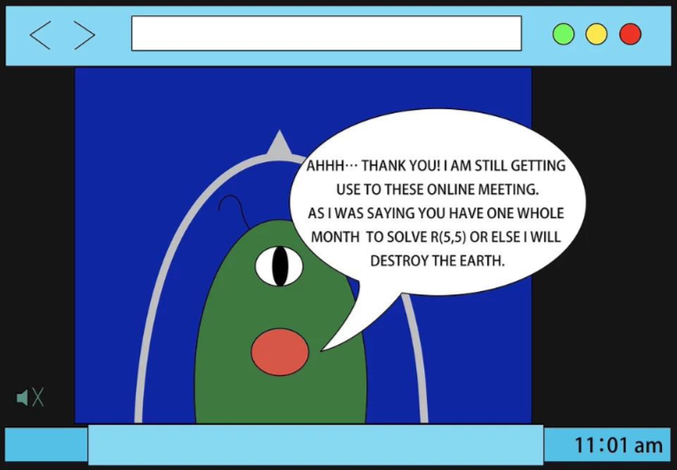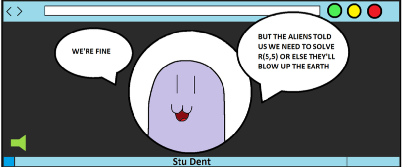 \(\textbf{Summary:}\) The goal of this project is to show that with the current computational capability there is not enough time to find \(R(6,6)\text{.}\) Our goal is to visually show how to calculate the Ramsey number for a small number of red and blue. We will illustrate how to solve \(R(3,3)\) in our comics and then try to generalize the result for \(R(5,5)\text{.}\) We also explore the number of combinations we need for \(R(5,5)\) and \(R(6,6)\text{.}\) This will give readers an intuition about how long it will take for an average or top of the line computer and if Moore's law will even give us enough transistors to solve this problem. And as Erdős said we would be hopeless and have to fight the aliens.