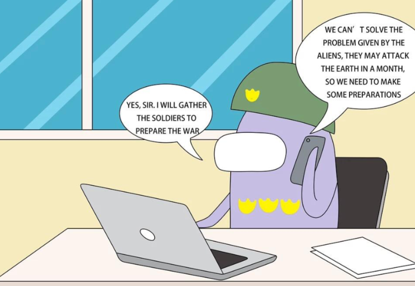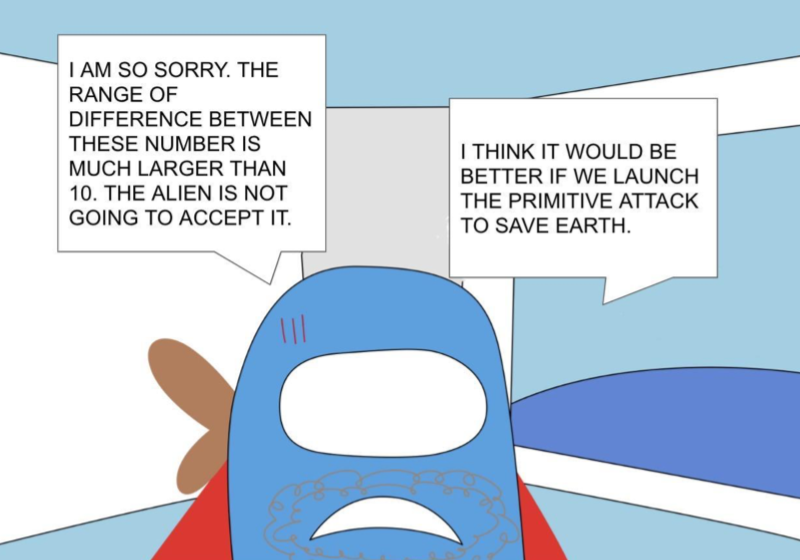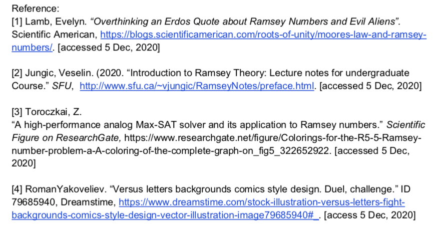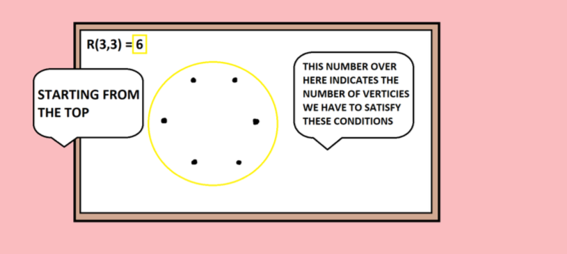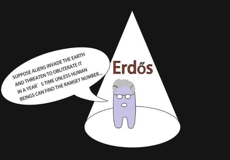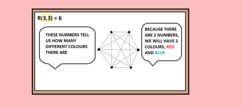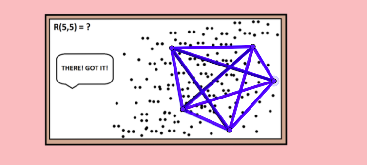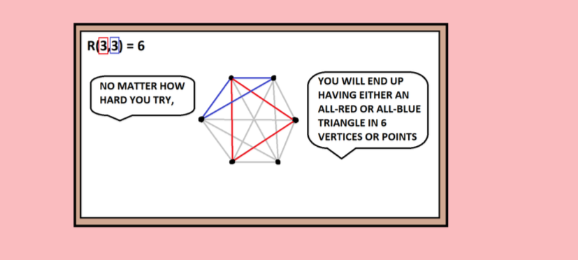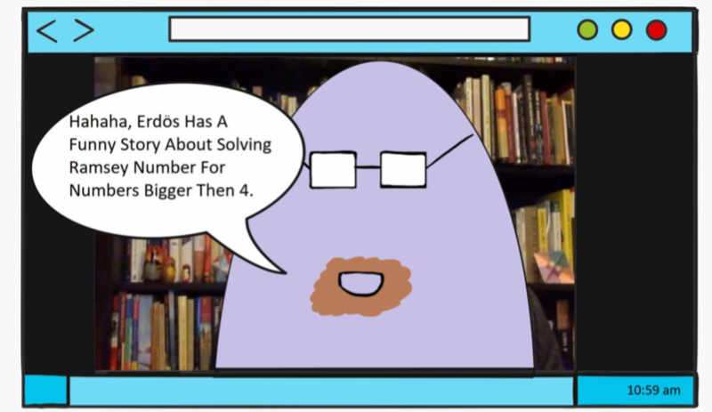 \(\textbf{Summary:}\) The goal of this project is to show that with the current computational capability there is not enough time to find \(R(6,6)\text{.}\) Our goal is to visually show how to calculate the Ramsey number for a small number of red and blue. We will illustrate how to solve \(R(3,3)\) in our comics and then try to generalize the result for \(R(5,5)\text{.}\) We also explore the number of combinations we need for \(R(5,5)\) and \(R(6,6)\text{.}\) This will give readers an intuition about how long it will take for an average or top of the line computer and if Moore's law will even give us enough transistors to solve this problem. And as Erdős said we would be hopeless and have to fight the aliens.