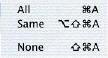 All: Selects all the graphics on the current page. If you’re editing a Text Area, selects all the text in the Text Area and all Text Areas linked to the current Text Area.