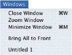 Contains the names of all open Create documents. Choose a document to make it active. Windows that have been modified since their last save are marked with a dot.