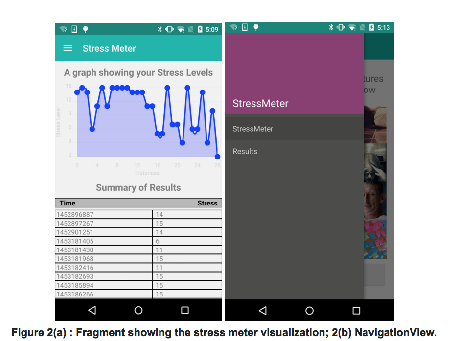 You should visualize the data that is being stored in the csv file (a CSV is a comma separated values file) by reading the data from the csv file, and using the graph plotting library to plot the graphs, as shown in Figure 2(a). Furthermore, you also display a table showing the stress meter score and timestamp. Once you try out the app this will all become clear.