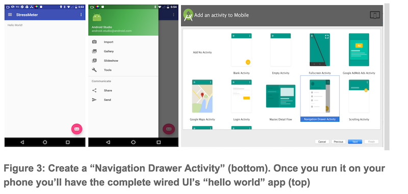 You should first create a new project call it StressMeter. As shown in Figure 3 you should create a Navigation Drawer Activity. Figure 3 shows the template for creating the activity and the two views of the HelloWorld activity that Android studio wires for you.